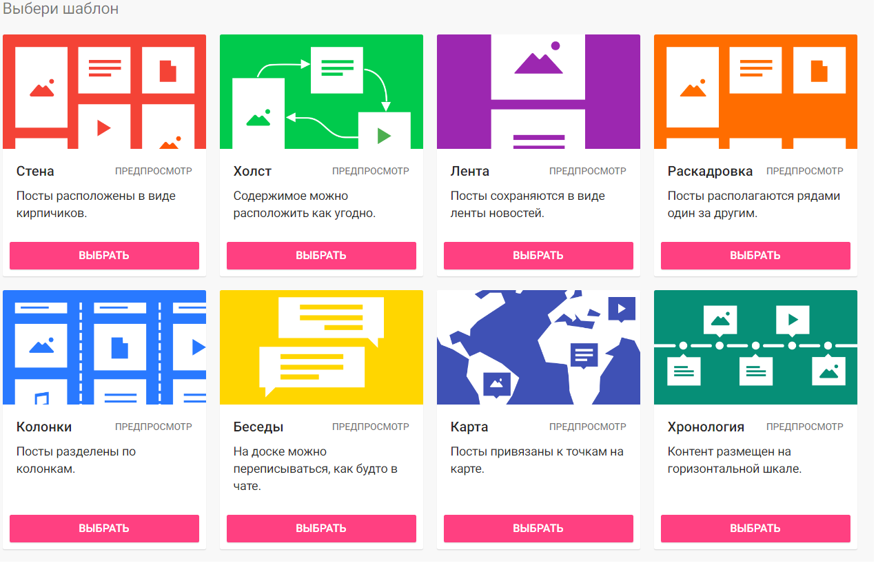 Изначально виртуальные доски создавались скорее для проектной деятельности и координации действий бизнес-менеджеров, чем для работы учителей. Этот факт сказывается, в частности, на наборе шаблонов, которые существуют в каждой онлайн-доске. Padlet – одна из немногих досок, предлагающих набор шаблонов для обучения. Большинство же инструментов предоставляют шаблоны в логике организации бизнес-процессов.