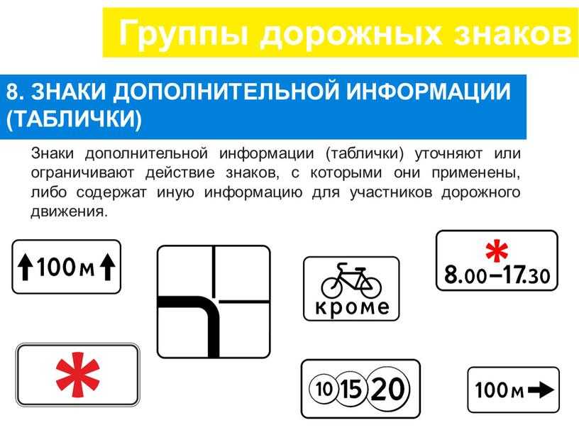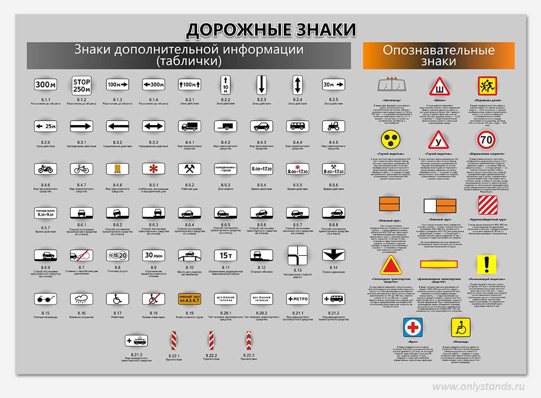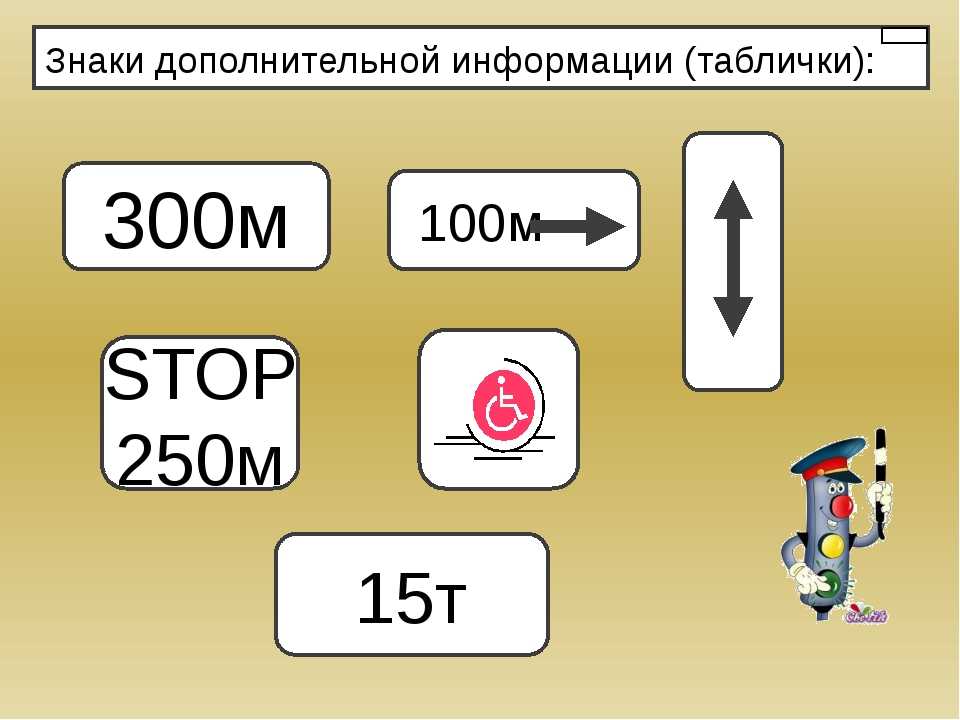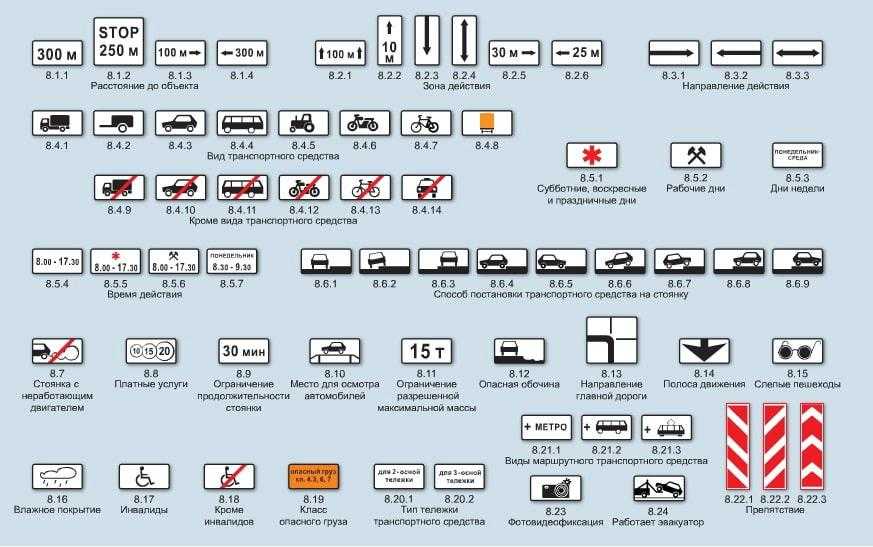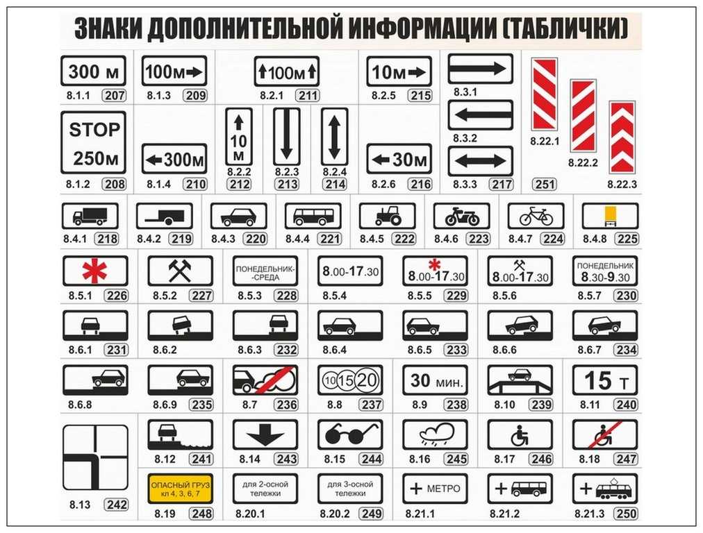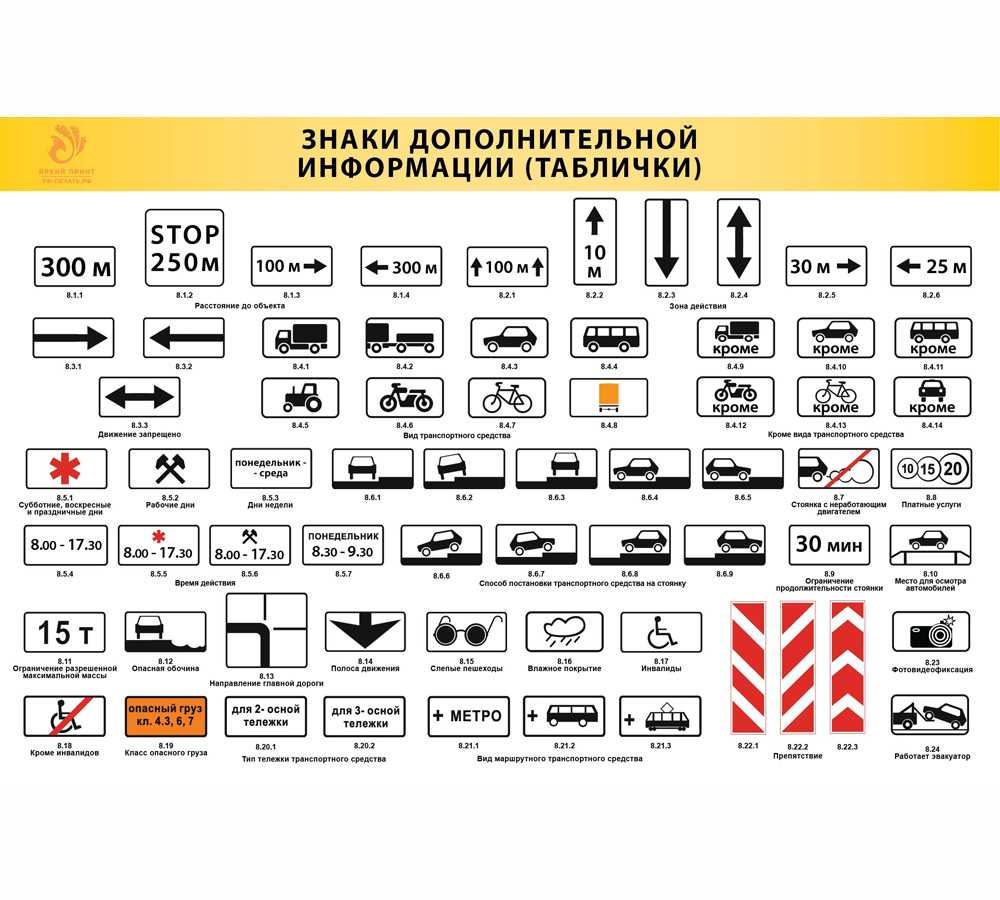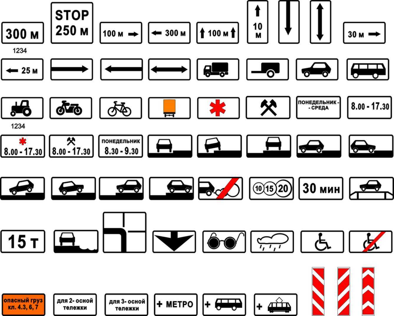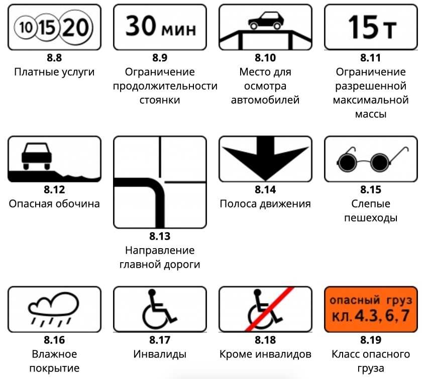Группа персонажей под номером 8 довольно большая. И далеко не все они подходят под все основные обозначения. В ПДД включены следующие знаки дополнительной информации, то есть таблички с пояснениями: