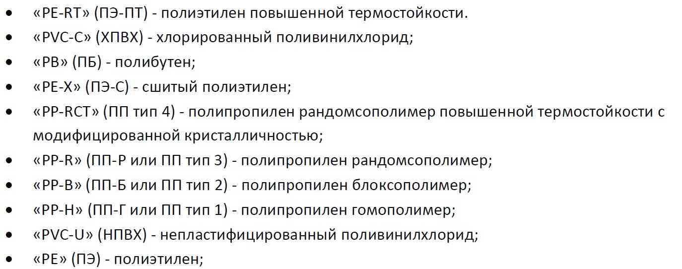 Пластиковые трубы и различные фитинги производятся из термопластов следующих видов:
