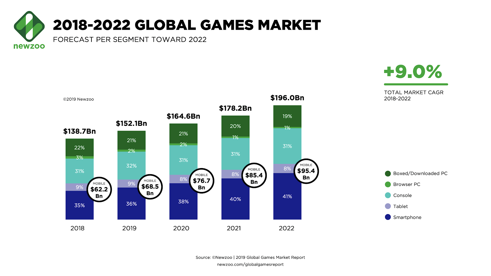 В совокупности в 2018 году люди потратили на игры $138 млрд (на кино — всего $42 млрд). Сегодняшняя тенденция показывает, что в 2019 году траты увеличатся до $152.1 млрд, а в 2022 будут составлять не менее $196 млрд. В среднем доходы от видеоигр растут на 9% ежегодно.