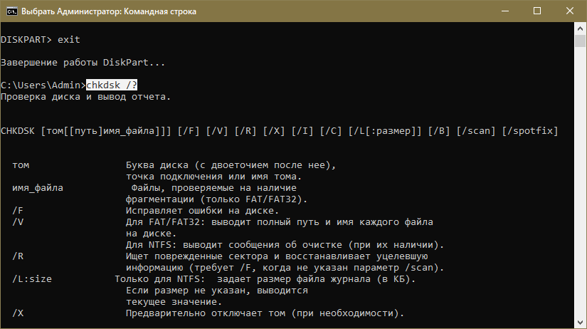 При таких параметрах все найденные ошибки по возможности будут устранены в автоматическом режиме. Также будет проведена дополнительная проверка на битые сектора. Если вы хотите использовать иные параметры, введите в строку «chkdsk /?»: