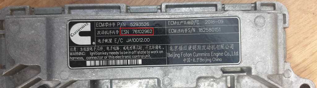 Моторы Cummins, которые оснащены электронной системой управления имеют электронный модуль. На нем находится информационная табличка, в которой указаны серия и номер двигателя, код калибровки, дата выпуска. Также в блоке управления ДВС есть данные с серийным номером. Считать эту информацию можно подключив диагностику. Если электронный модуль менялся, или выполнялась его калибровка данные могут не сохраниться или быть некорректными.