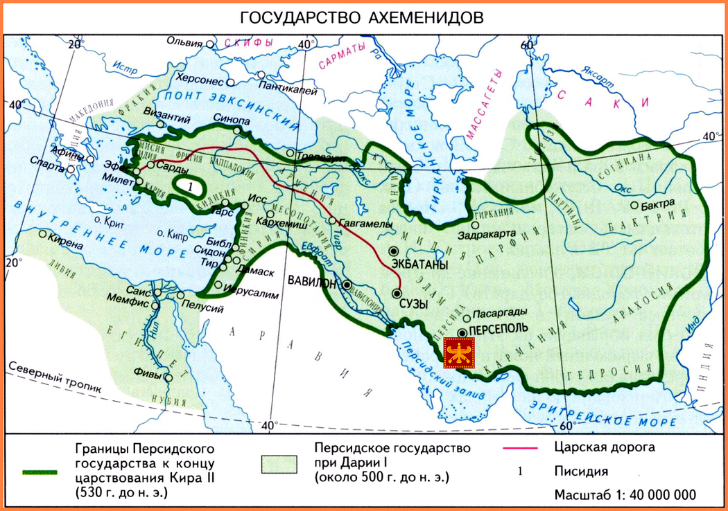 Персидская империя (держава Ахеменидов) — древнее государство, существовавшее в VI—IV веках до н. э. на территории Передней Азии и северо-восточной Африки, созданное персидской династией Ахеменидов. К концу VI века до нашей эры границы Ахеменидской державы простирались от реки Инд на востоке до Эгейского моря на западе, от первого порога Нила на юге до Закавказья на севере. Население империи составляло от 25 до 50 млн человек, что соответствовало половине населения Земли в V—IV вв. до нашей эры.