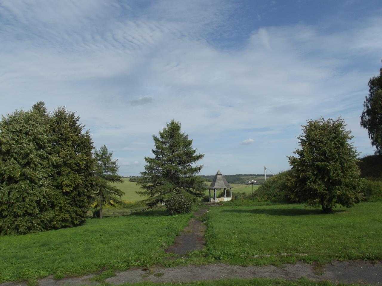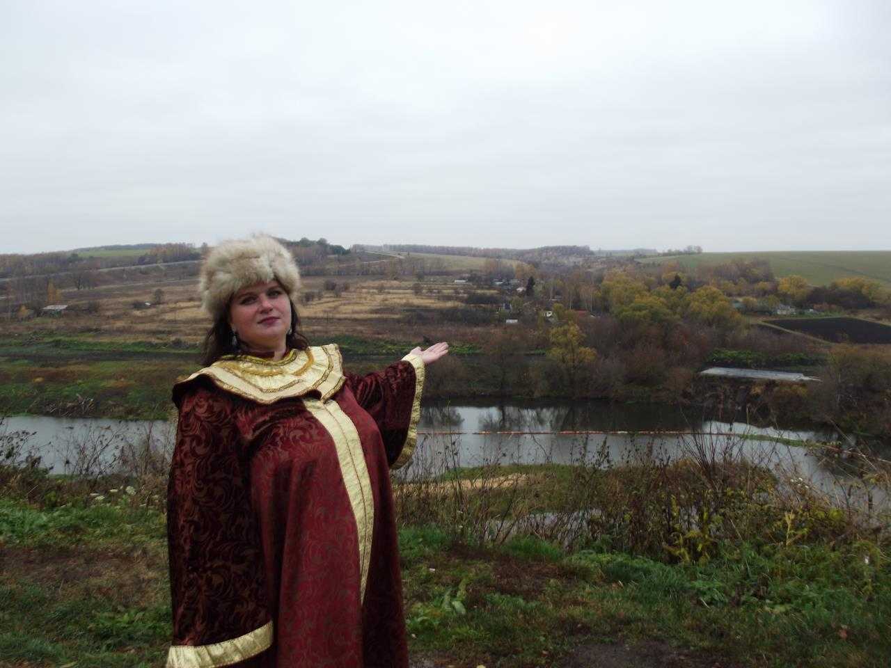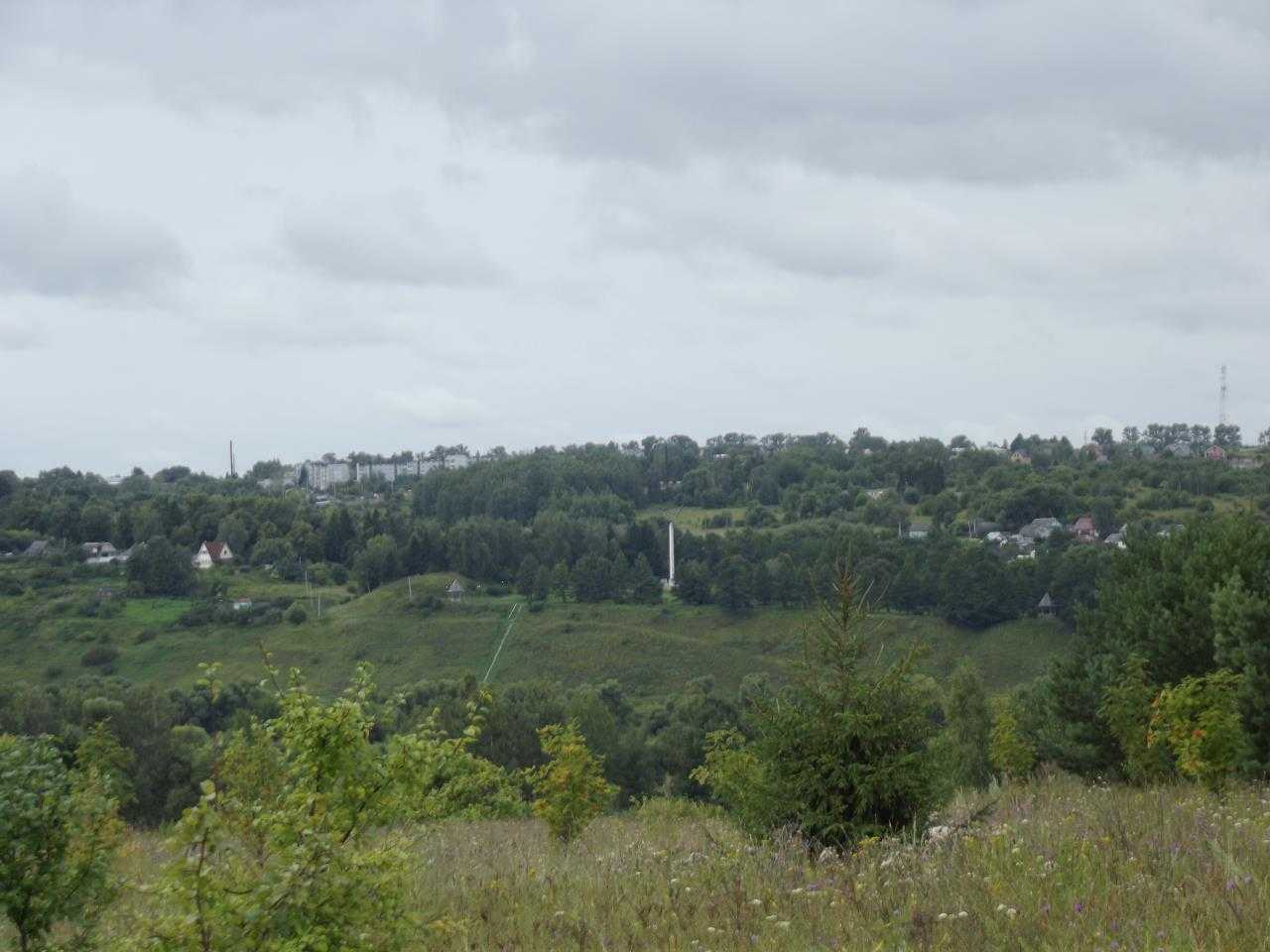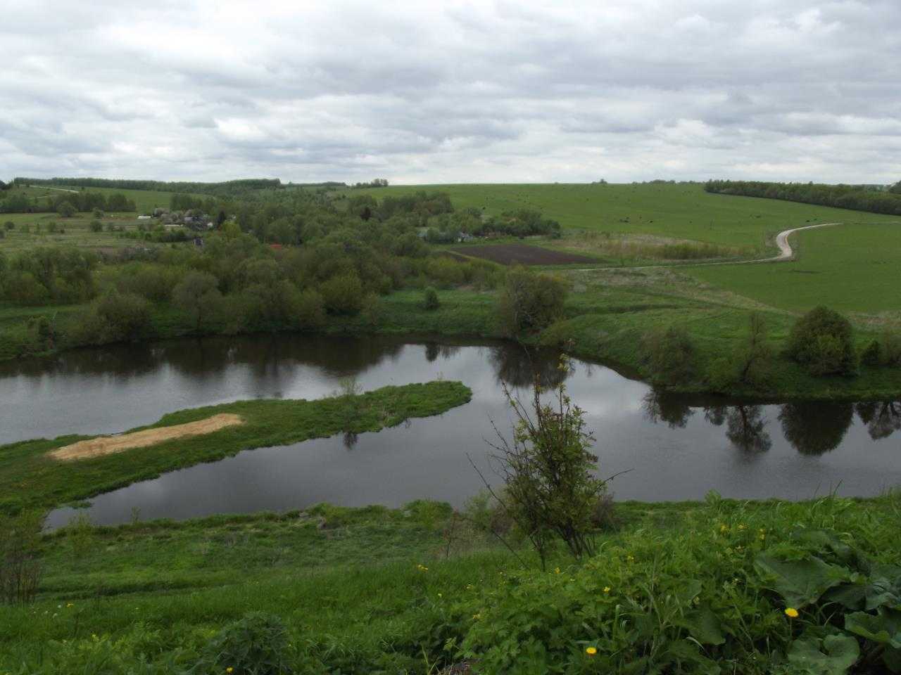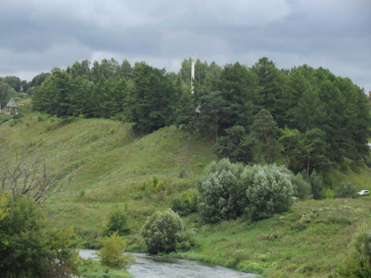 Из беседок крутого восточного склона городища открываются чудесные виды на реку Упу и окрестные изумрудные поля, деревни и величавый Рождества Богородицы Анастасов мужской монастырь.