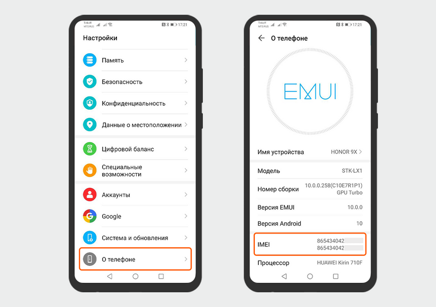 У Honor 9X две SIM-карты, поэтому в настройках указано два IMEI
