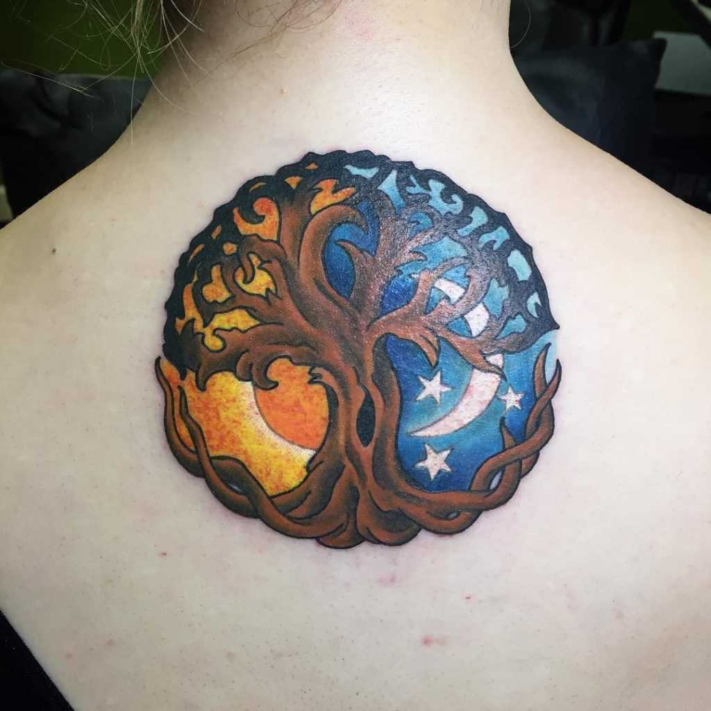 Как правило, черно-белый круг помещается в центр мандалы, представляющей баланс как центральный принцип вселенной. Наиболее удачно такой дизайн Инь Янь смотрится на спине.