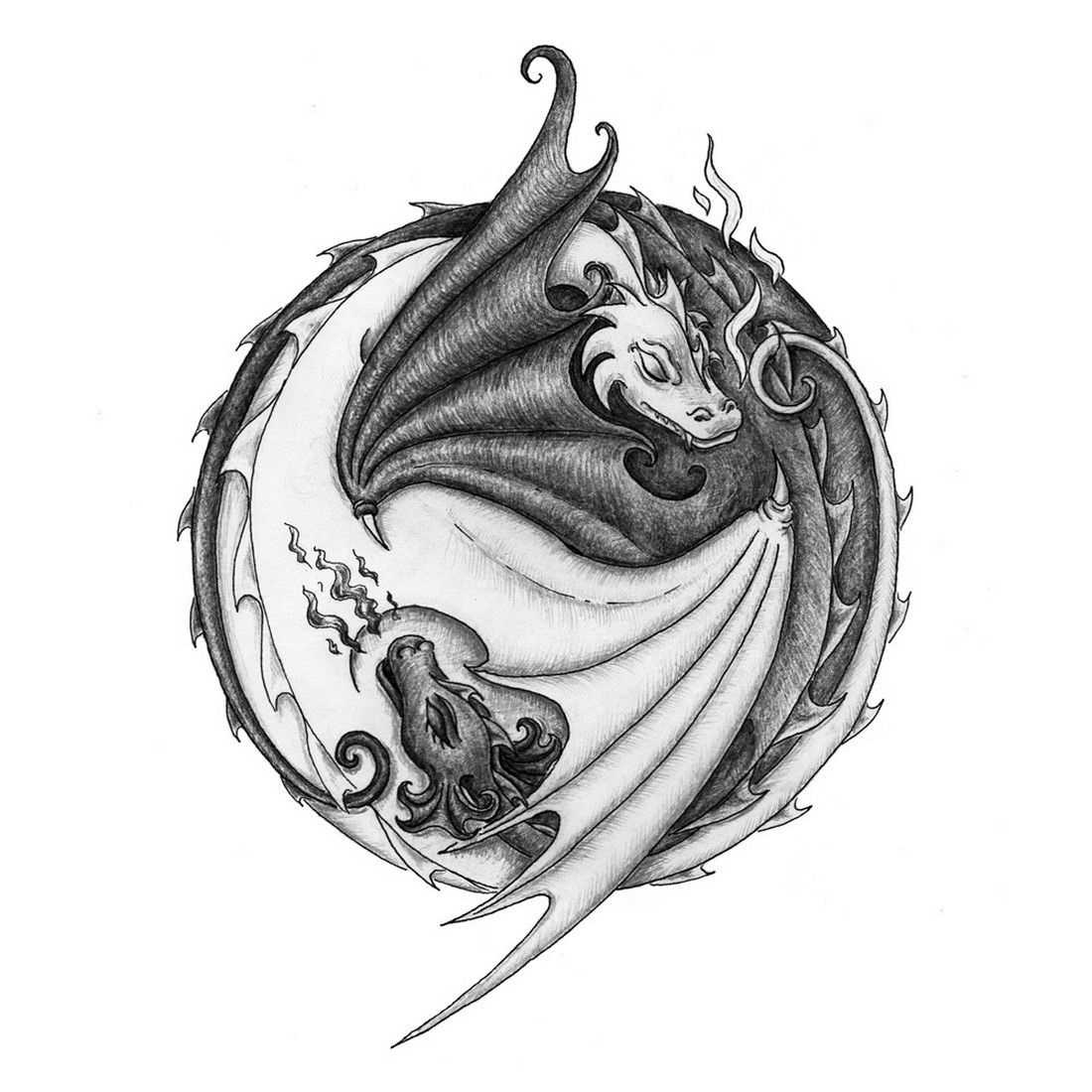 - Инь-янь с драконом – сила, внутренняя гармония и мудрость. Варианты эскизов – зверь держит символ в лапах или же обвивает его. Демонстрируя противоположности, дракона набивают совместно с тигром.