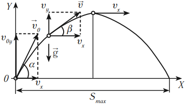 - равномерного движения по горизонтали со скоростью \( v_0=v_{0x} \);