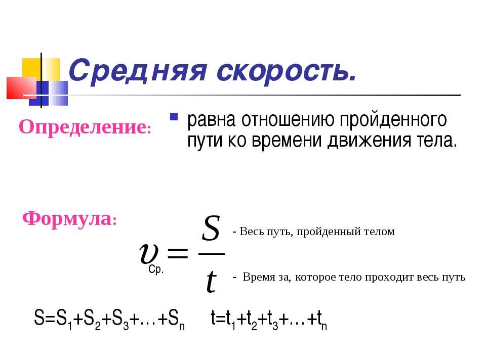 Еще одна важная характеристика, использующаяся в кинематике – средняя путевая скорость. Из названия вытекает, что средняя путевая скорость – это отношение пути (S), пройденного телом, к отрезку времени (t), за которое оно этот путь прошло: