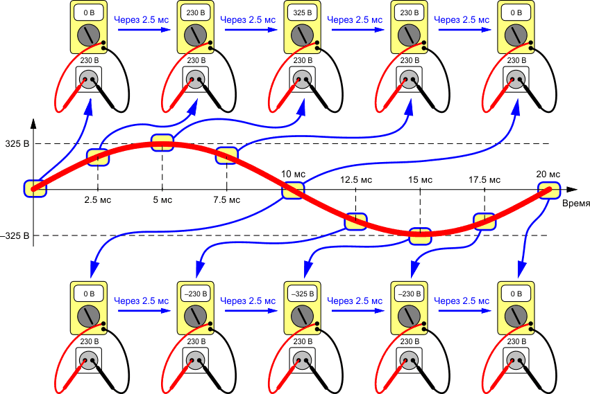 | Рисунок 2. | Мгновенное значение напряжения в розетке в разные моменты времени. |