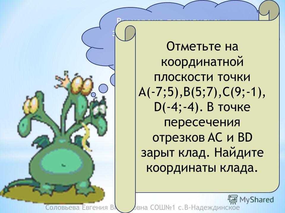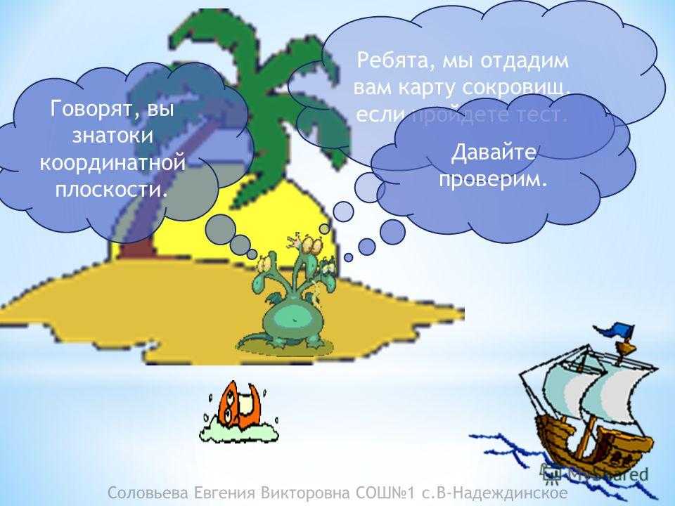 Соловьева Евгения Викторовна СОШ1 с.В-Надеждинское Ребята, мы отдадим вам карту сокровищ, если пройдете тест. Говорят, вы знатоки координатной плоскости. Давайте проверим.