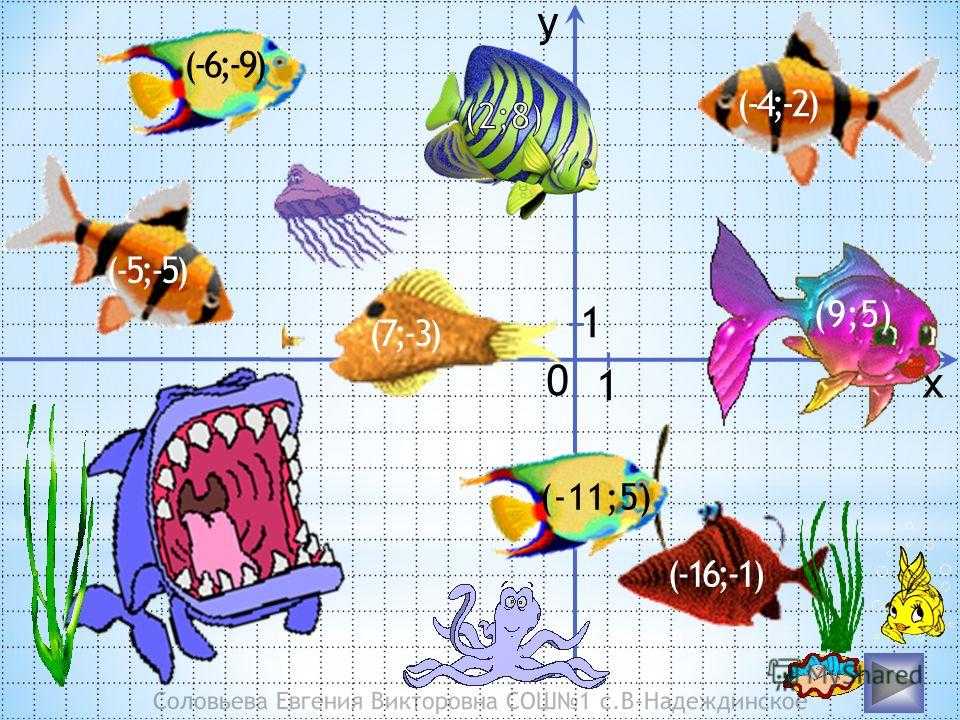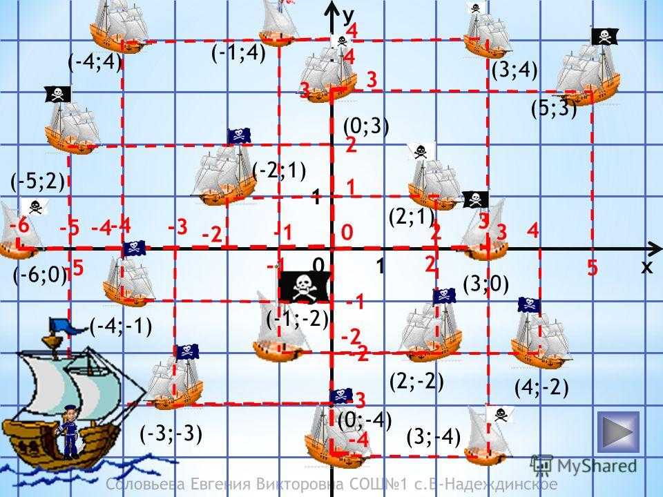 Соловьева Евгения Викторовна СОШ1 с.В-Надеждинское y x (-1;-7)(4;8)(-3;-2) (6;0)(-5;4) (-8;0) (0;-7)(0;8) (0;4)(0;4) (0;-2) (0;-5) Ветер по морю гуляет И кораблик подгоняет; Он бежит себе в волнах На раздутых парусах… Но что это на линии горизонта? Поднять команду на борт