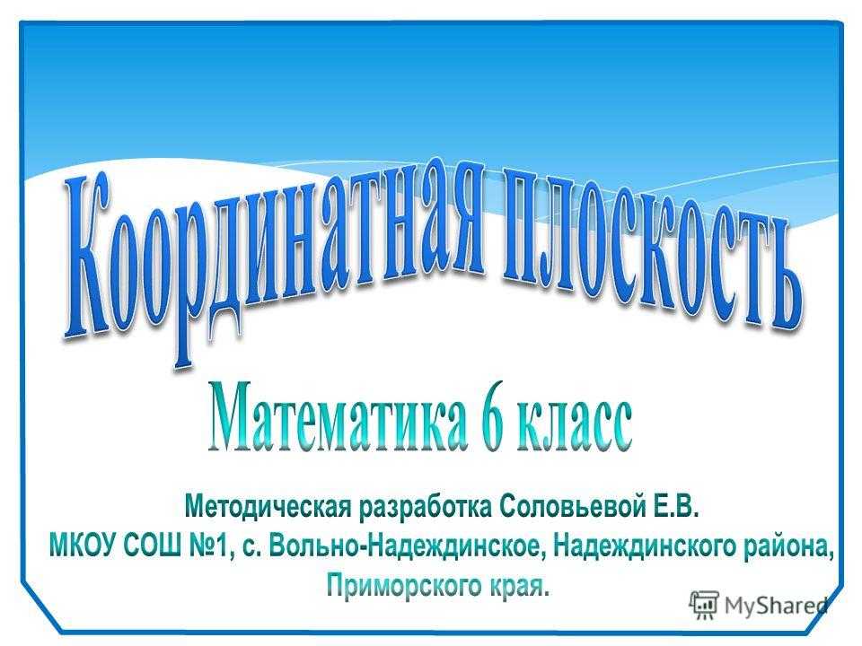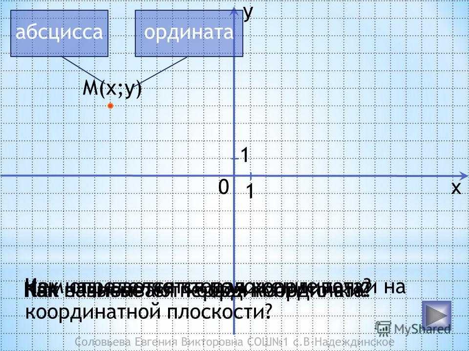 Соловьева Евгения Викторовна СОШ1 с.В-Надеждинское y x Чем определяется положение точки на координатной плоскости? Как записывают координаты точки? М(х;у) Как называется первая координата? Как называется вторая координата? ордината абсцисса