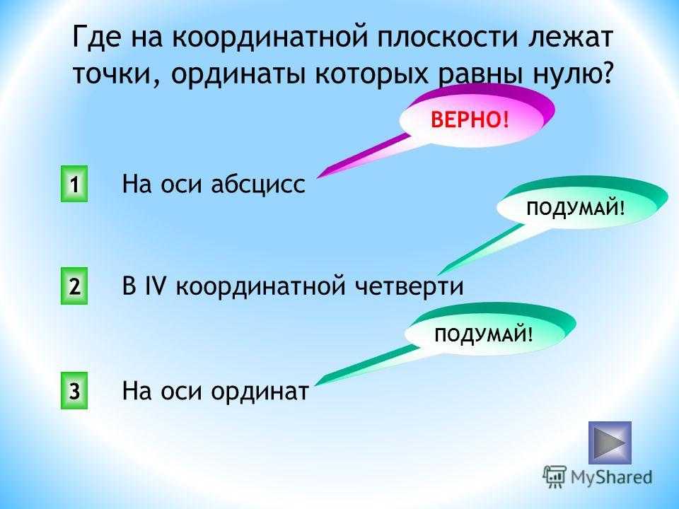 Где на координатной плоскости лежат точки, ординаты которых равны нулю? ПОДУМАЙ! ВЕРНО! ПОДУМАЙ! На оси абсцисс В IV координатной четверти На оси ординат