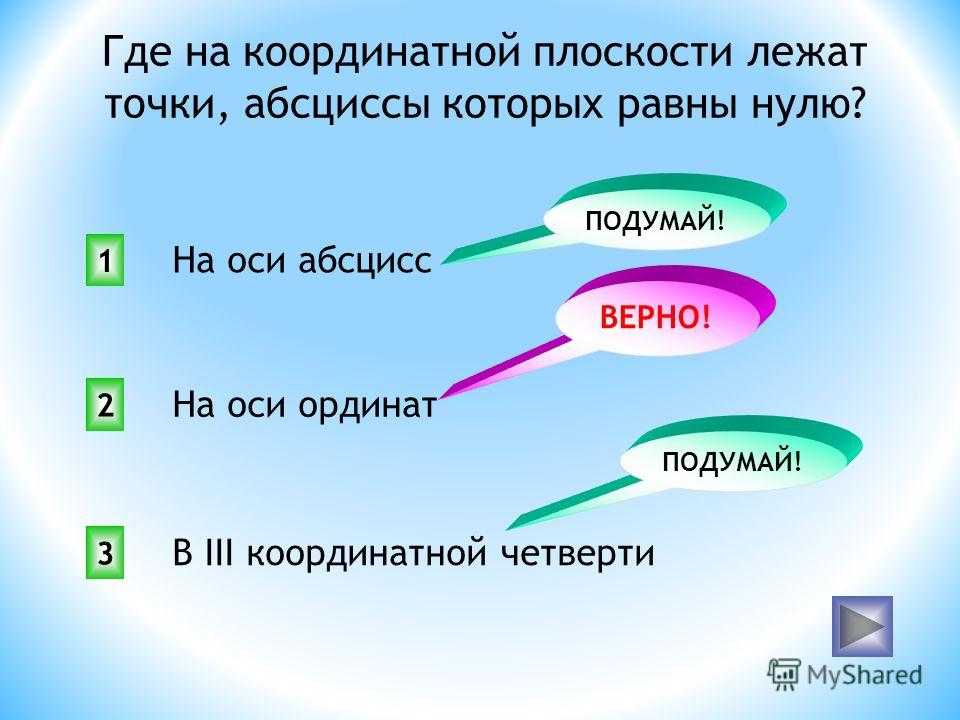 Где на координатной плоскости лежат точки, абсциссы которых равны нулю? ПОДУМАЙ! ВЕРНО! ПОДУМАЙ! На оси абсцисс На оси ординат В III координатной четверти