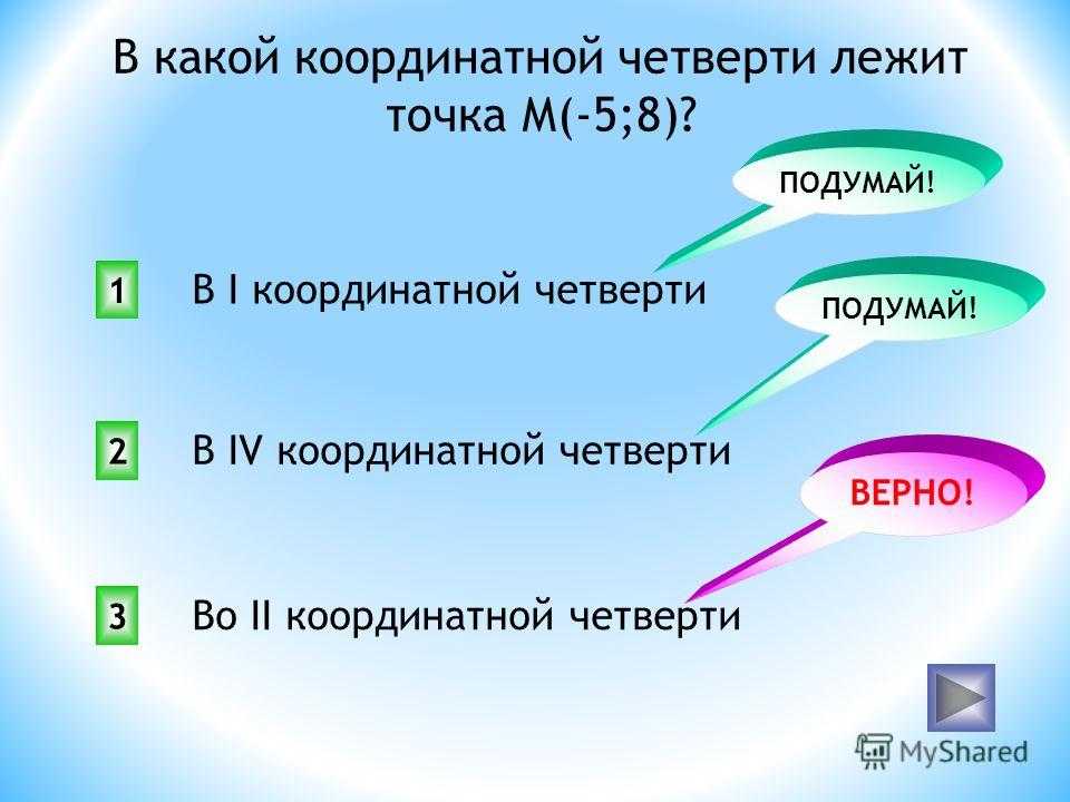 В какой координатной четверти лежит точка М(-5;8)? ПОДУМАЙ! ВЕРНО! ПОДУМАЙ! В I координатной четверти В IV координатной четверти Во II координатной четверти