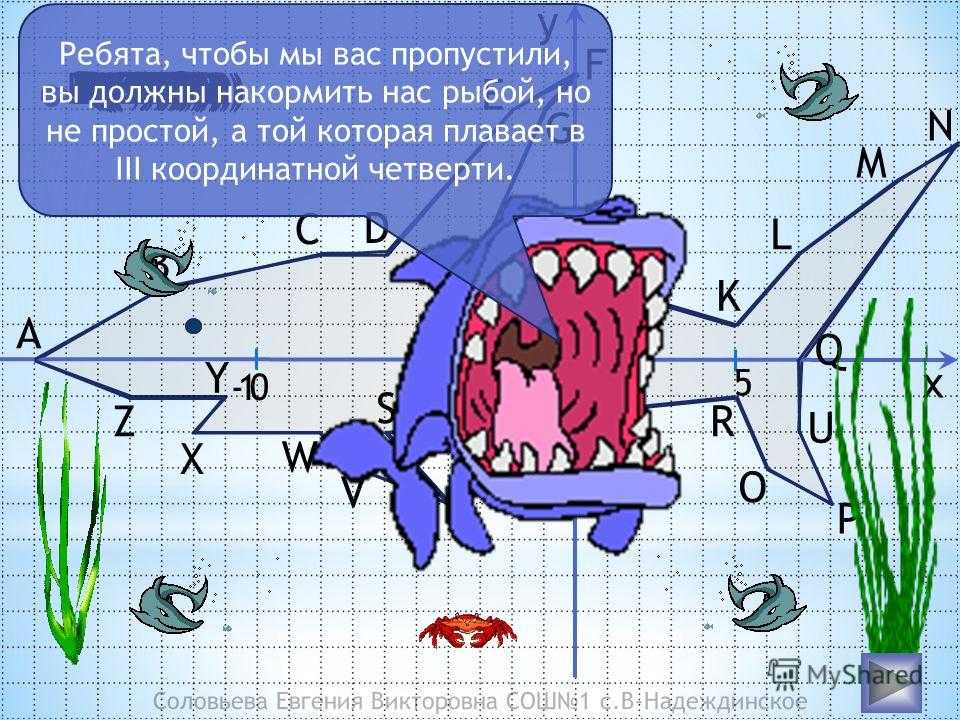 y x A(-17;0)Z(-14;-1)Y(-11;-1)X(-12;-2)W(-8;-2)V(-7;-3)T(-4;-4)S(-6;-2)O(6;-3)R(5;-1)P(8;-4)U(7;-2)Q(7;0) N(12;6)M(10;5) L(7;3) K(5;1) H(-3;3)G(-1;7)F(0;8) E(-2;7) D(-6;3) C(-8;3) B(-13;2) A(-17;0) A B C D E F G H K L M N Q U P O R S T V W X Y Z Ребята, чтобы мы вас пропустили, вы должны накормить нас рыбой, но не простой, а той которая плавает в III координатной четверти.