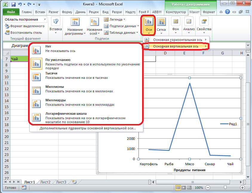 Чтобы изменить вертикальную подпись, кликаем по кнопке «Оси», и далее переходим по наименованию «Основная вертикальная ось». Как видим, в данном случае, нам представляется больше вариантов выбора размещения подписи на оси. Можно вообще не показывать ось, а можно выбрать один из четырех вариантов отображения чисел:
