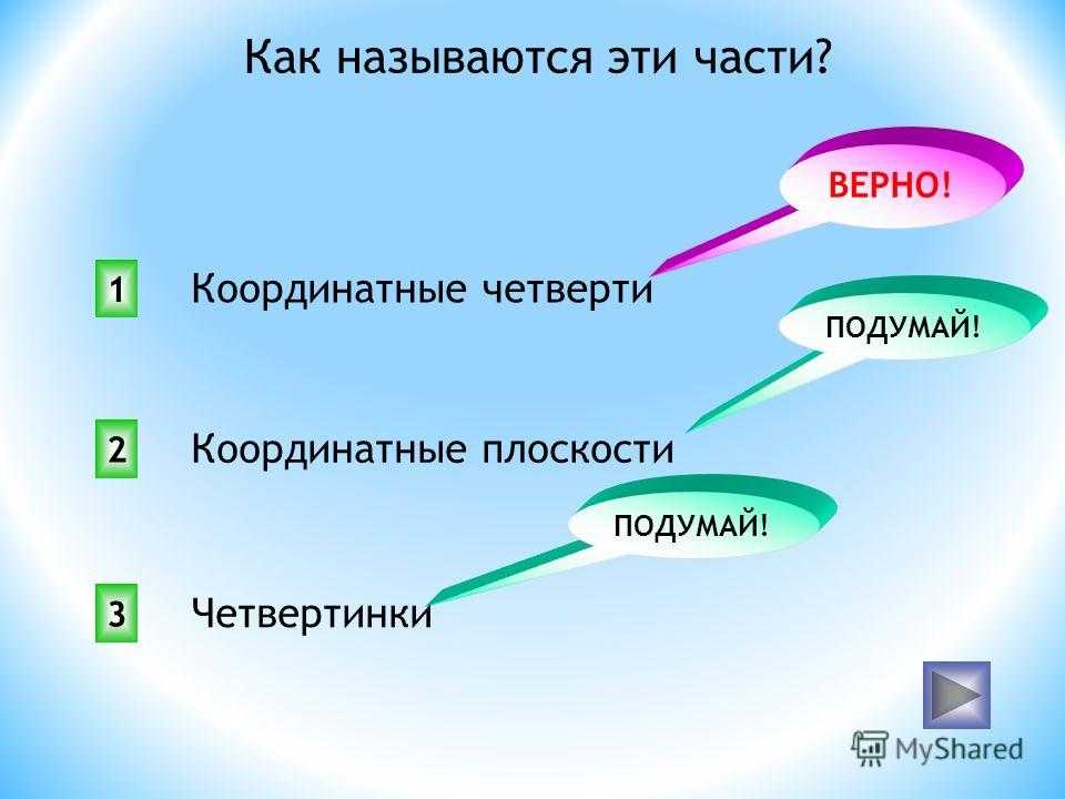 Как называются эти части? ПОДУМАЙ! ВЕРНО! ПОДУМАЙ! Координатные четверти Координатные плоскости Четвертинки
