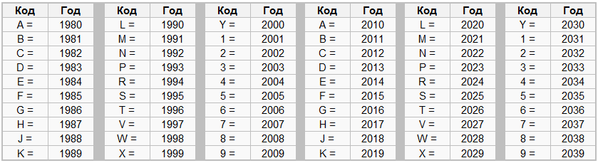 - Года с 1980 по 2000 указаны буквами A, B, C и вплоть до Y (буквы I, O, Q, U, Z для маркировки не используются).