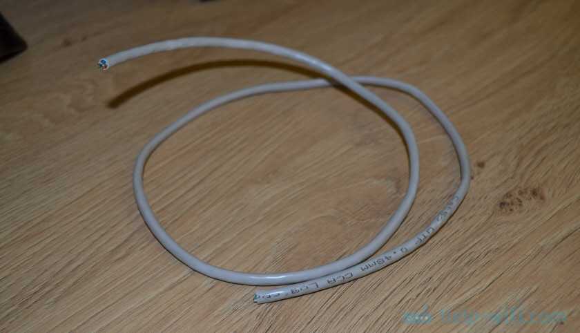 - применяя канцелярский ножик, нужно снять верхний шар изоляции на расстоянии около 4-х сантиметров от конца провода. Такую же операцию необходимо проделать и с другим кабелем;