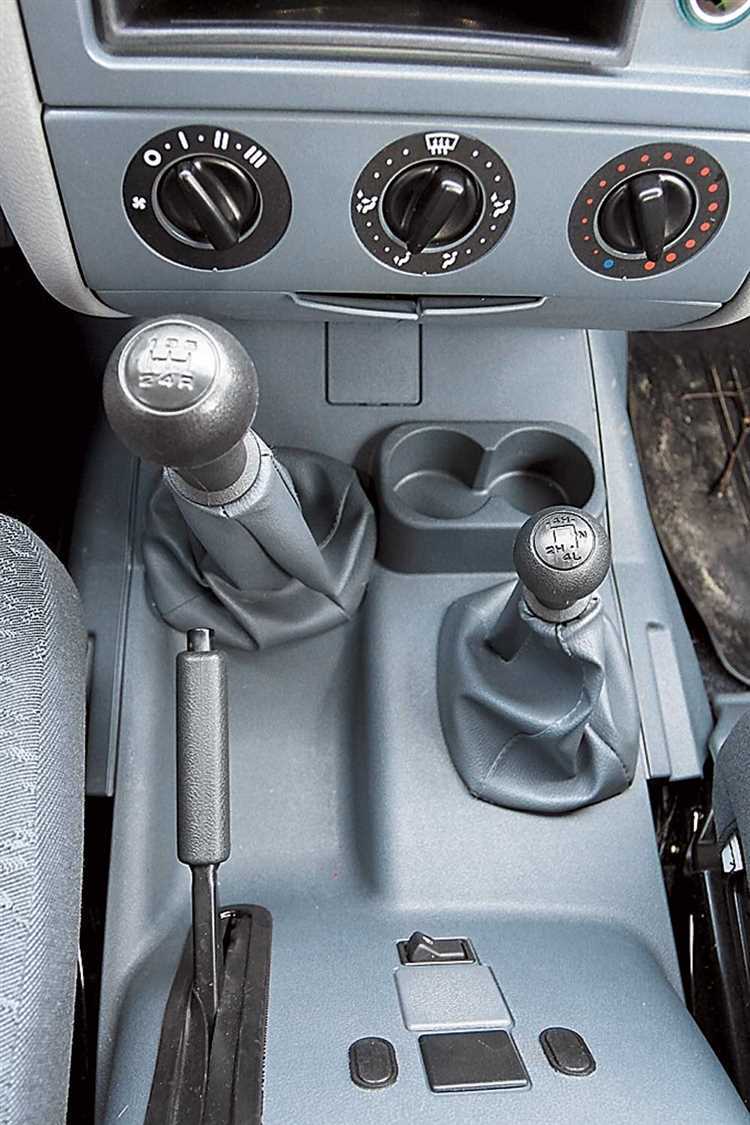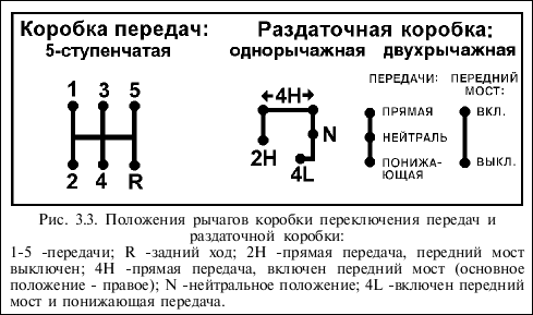 - Движение рычага вправо и до упора позволяет включить пониженный ряд в раздаточном редукторе с сохранением передачи крутящего момента на передний и задний мост. Режим применяется при движении в сложных дорожных условиях (например, по снегу глубиной более 400 мм или по грязи, достигающей центра ступиц колес). Пониженная передача используется при движении в горах (в т. ч. с прицепом) или при форсировании болот или ручьев.