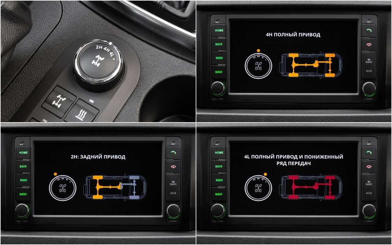 - Режим полного привода с прямой передачей 4Н, активируемый при движении по мокрым или скользким грунтовым или асфальтированным дорогам. При включении привода на панели приборов срабатывает контрольный индикатор. Завод рекомендует переключать режим только при движении по прямой. Активация привода на 2 моста при движении по дуге приводит к ударным нагрузкам на агрегаты трансмиссии. Если при повороте шайбы привод на передний мост не включается, то необходимо повысить или понизить скорость, а затем повторить попытку.