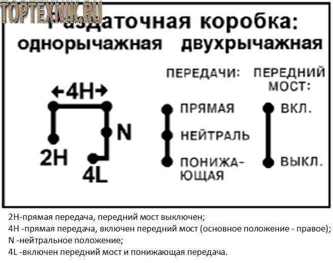 Положения рычага управления редуктором на УАЗ «Патриот»:
