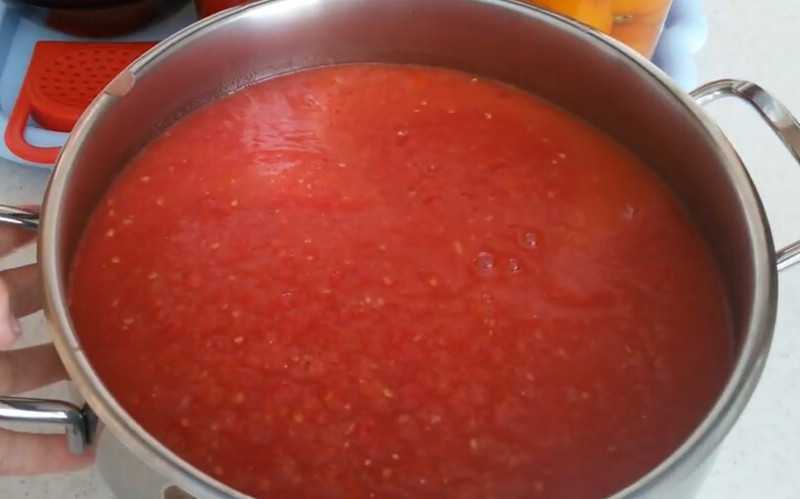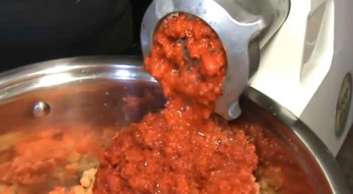 За это время пропускаем через мясорубку помидоры и выливаем их в отдельную кастрюлю. Добавляем помидорный сок в овощную массу и варим еще 30 минут на небольшом огне, прикрыв кастрюлю крышкой. Не забываем помешивать, чтобы не пригорело.