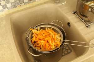 Это сделано для того, чтобы засахаренные апельсиновые корки были менее горькими. После того, как корочки трижды прокипятились, оставляем их на дуршлаге, чтобы в стекле была лишняя влага.