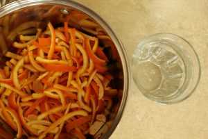 - Приготовление следует начинать с предварительной подготовки корочек. Для этого их промывают, заливают водой и ставят кипятить. После закипания убавьте огонь и прокипятите кожуру еще 10 минут. Затем его откидывают на дуршлаг, промывают большим количеством холодной воды, желательно под краном.