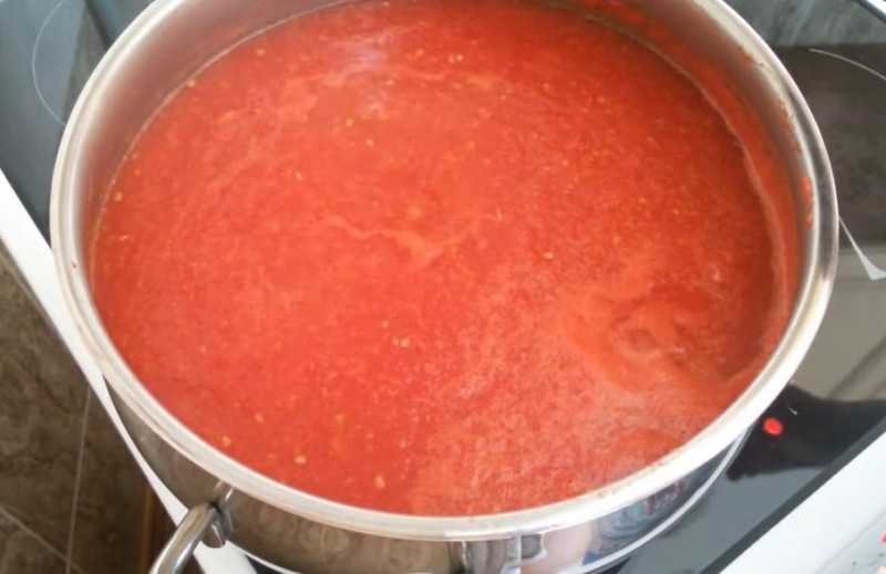 5. Тем временем ставим томатный сок на плиту и доводим до кипения. Кипятим на медленной огне минут 15, периодически убирая сверху появляющуюся пенку. Затем добавляем в него соль и сахар (из расчета 1 столовая ложка соли и 3 столовые ложки сахара на литр сока). Перемешиваем до полного растворения и даем томату снова закипеть.