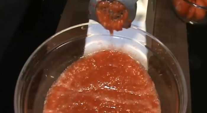 2. Те помидоры, которые предназначенные на переработку, превращаем в томатный сок. Для этого срезаем с них все ненужное (плодоножки, места с трещинами, все «испорченности»), а оставшееся хорошие части помидоров перебиваем блендером до однородной массы.