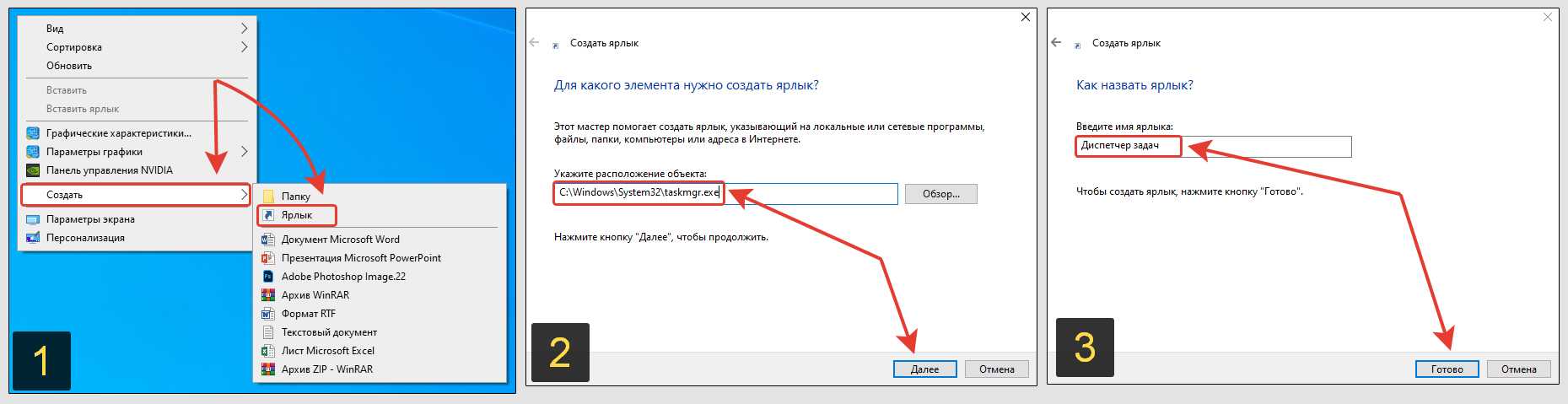 - Кликните правой кнопкой мыши по рабочему столу, выберите из контекстного меню «Создать» — «Ярлык»;