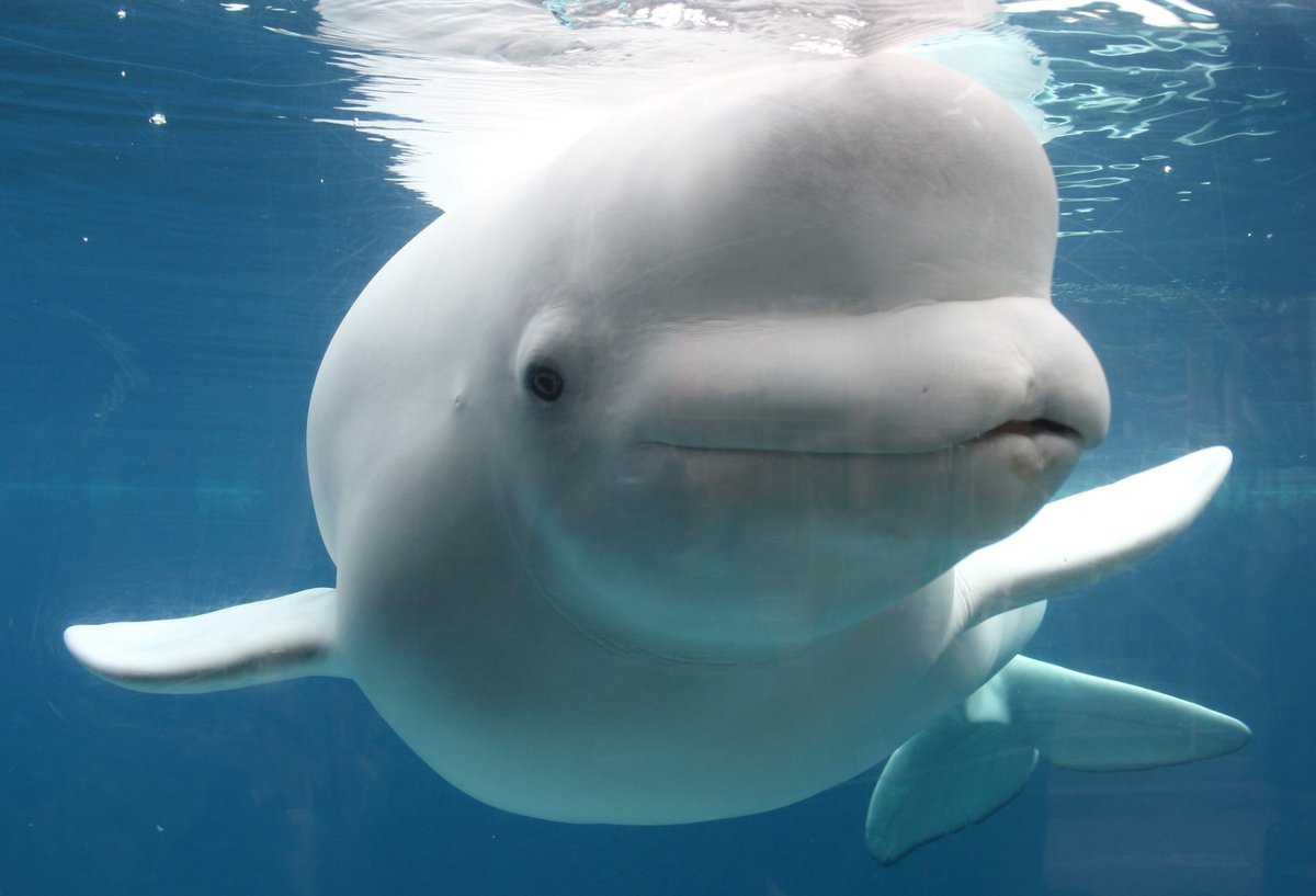 Белухи (полярные дельфины). Эти млекопитающие из отряда китообразных имеют белую уплотненную кожу, небольшую голову с выпуклым лбом, выдвинутую челюсть с 30-40 зубьями в виде клиньев, широкие грудные плавники и мощный хвост с размахом более 1 м. Средний вес взрослых белух составляет полторы тонны, длина тела — 6 м у самцов и 5 м у самок. Они живут и охотятся стаями, образуя группы до тысячи особей. Дышат полярные дельфины легкими, из-за чего им приходится подниматься к водной поверхности для заглатывания воздуха. Питаются моллюсками, рыбой и водорослями. Белухи умеют вращать головой и менять выражение лица. Кроме того, животные обладают прекрасным слухом и зрением.