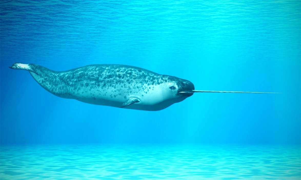 Нарвалы. Особенностью нарвалов является присутствие массивного рога, вырастающего до трехметровой длины. Такой увесистый отросток или точнее сказать зуб торчит прямо изо рта морских созданий. Посредством его особи пробивают ледяную корочку у водной поверхности, чтобы дохнуть воздуха, а также задействуют рог в сражении с самцами-соперниками в брачный период. Длина туловища нарвалов доходит до 4,5 м, масса – до 1 тонны. Рацион питания животных состоит из моллюсков и рыбы.