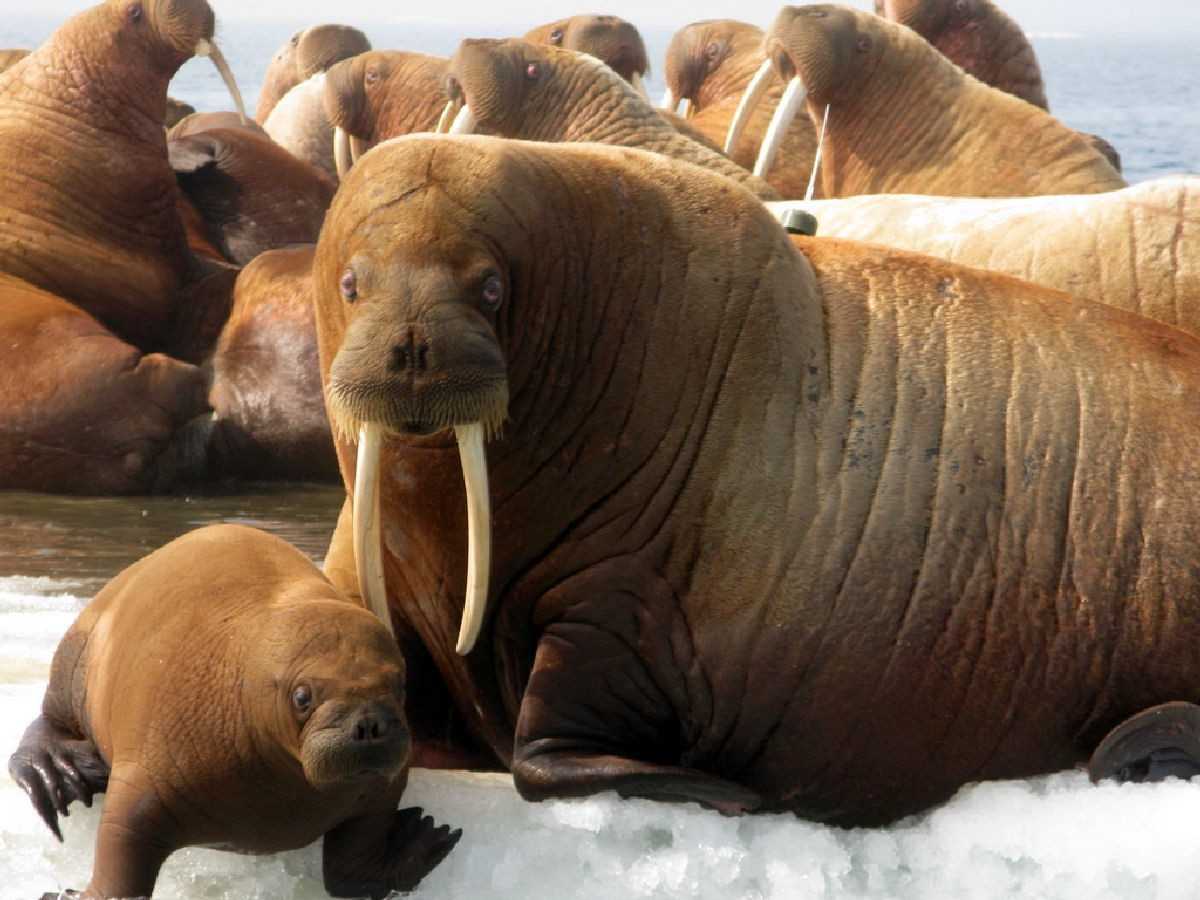 Моржи. Этих ближайших родственников тюленей отличают внушительные габариты и мощные выступающие клыки, вырастающие в длину до 80 см и служащие ластоногим своего рода приспособлением для охоты, обороны от других хищников или поднимания на льдины. Жировая прослойка животных занимает до 25% от всей массы тела. В основу рациона млекопитающих входят моллюски, рыба, водоросли и прочая растительность, выкапываемая ими с морского дна. Молодые особи имеют небольшой шерстяной покров, исчезающий по мере взросления.