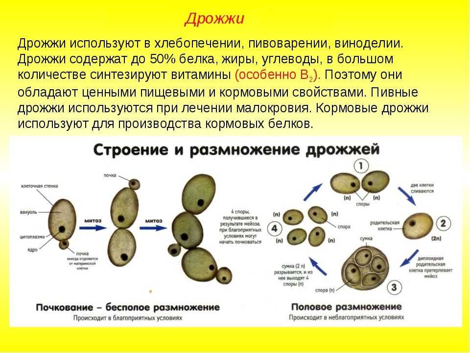 Тело дрожжевых грибов сильно отличается от всех остальных из-за того, что оно состоит всего-навсего из одной клетки и поэтому не образует мицелия (грибницы). А их размножение — очень интересное явление. На клетке появляется маленькое выпячивание, которое растёт, образуя так называемую почку и постепенно превращается в самостоятельную клетку, которая в состоянии отделиться и, в конечном итоге, — отделяется. Этот процесс называется почкованием.