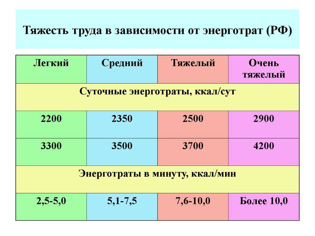 Физический труд характеризуется большой нагрузкой на организм, требующей преимущественно мышечных усилий и соответствующего энергетического обеспечения, а также оказывает влияние на функциональные системы (сердечно-сосудистую, нервно-мышечную, дыхательную и др.), стимулирует обменные процессы. Основным его показателем является тяжесть. Энергозатраты при физическом труде в зависимости от тяжести работы составляют 4000 – 6000 ккал в сутки, а при механизированной форме труда энергетические затраты составляют 3000 – 4000 ккал.