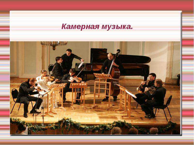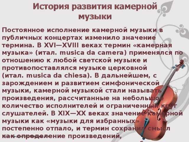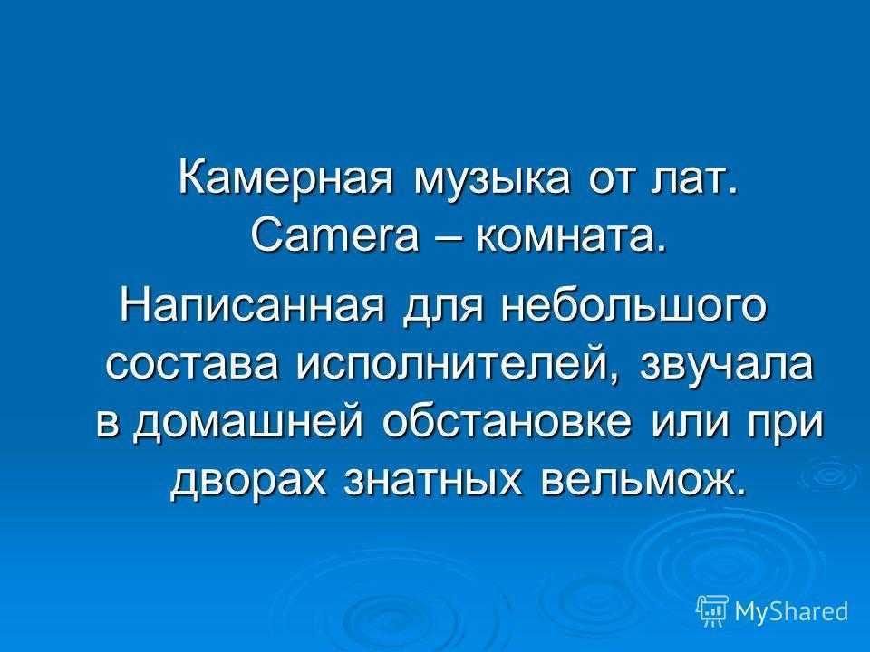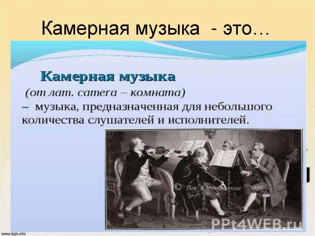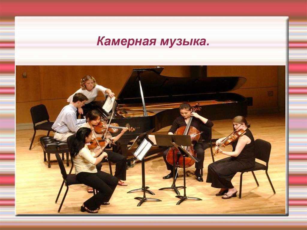 Понятие “камерная музыка” используется для обозначения музыкальных произведений, которые исполняются в небольших помещениях, в небольшом составе.