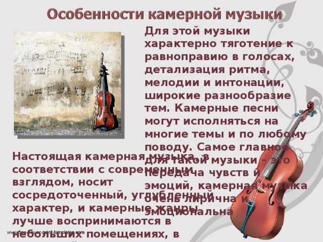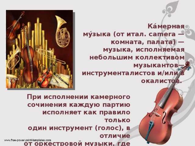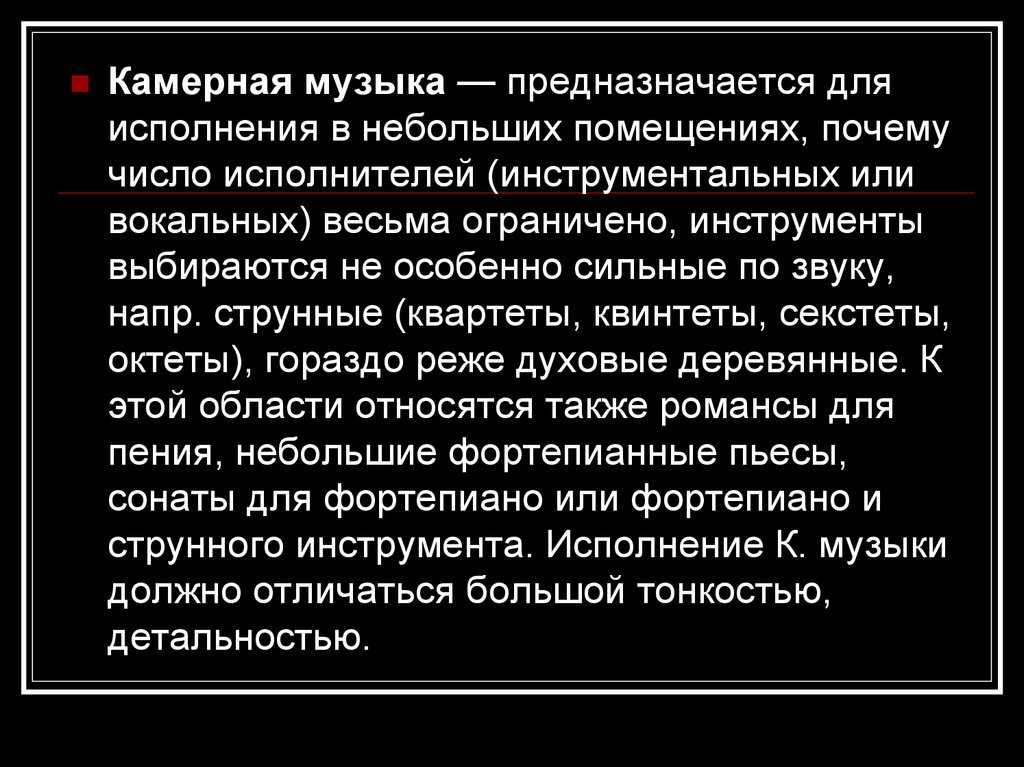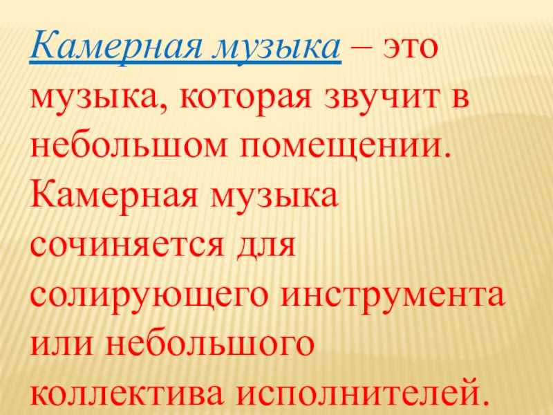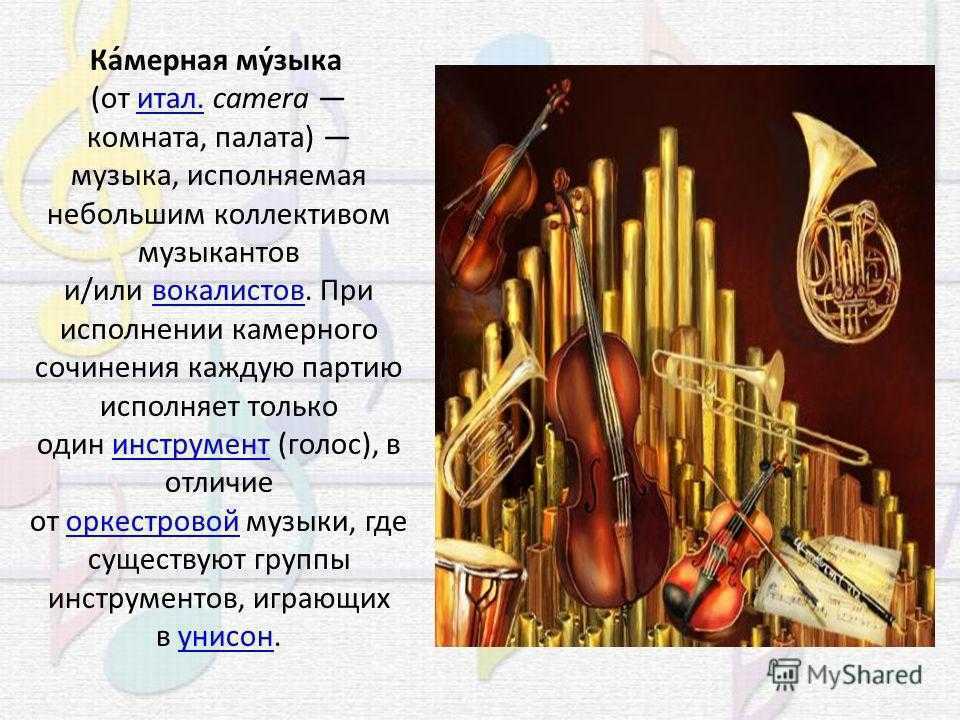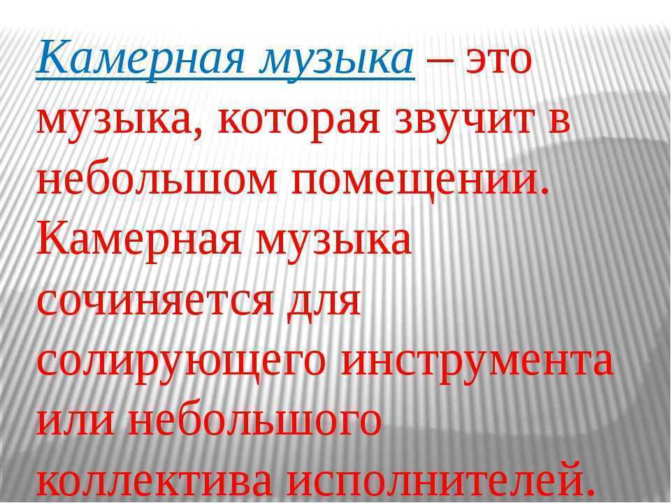 Понятие “камерная музыка” используется для обозначения музыкальных произведений, которые исполняются в небольших помещениях, в небольшом составе.