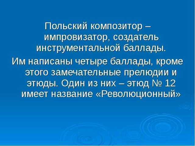 Польский композитор – импровизатор, создатель инструментальной баллады. Польский композитор – импровизатор, создатель инструментальной баллады. Им написаны четыре баллады, кроме этого замечательные прелюдии и этюды. Один из них – этюд № 12 имеет название «Революционный»