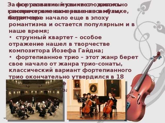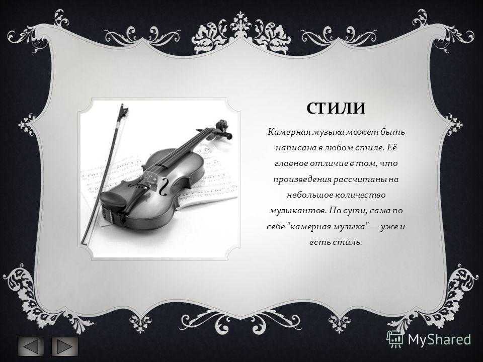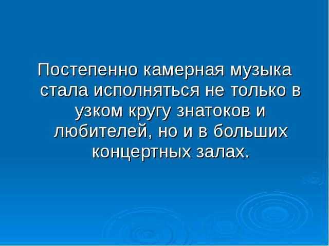 Постепенно камерная музыка стала исполняться не только в узком кругу знатоков и любителей, но и в больших концертных залах. Постепенно камерная музыка стала исполняться не только в узком кругу знатоков и любителей, но и в больших концертных залах.