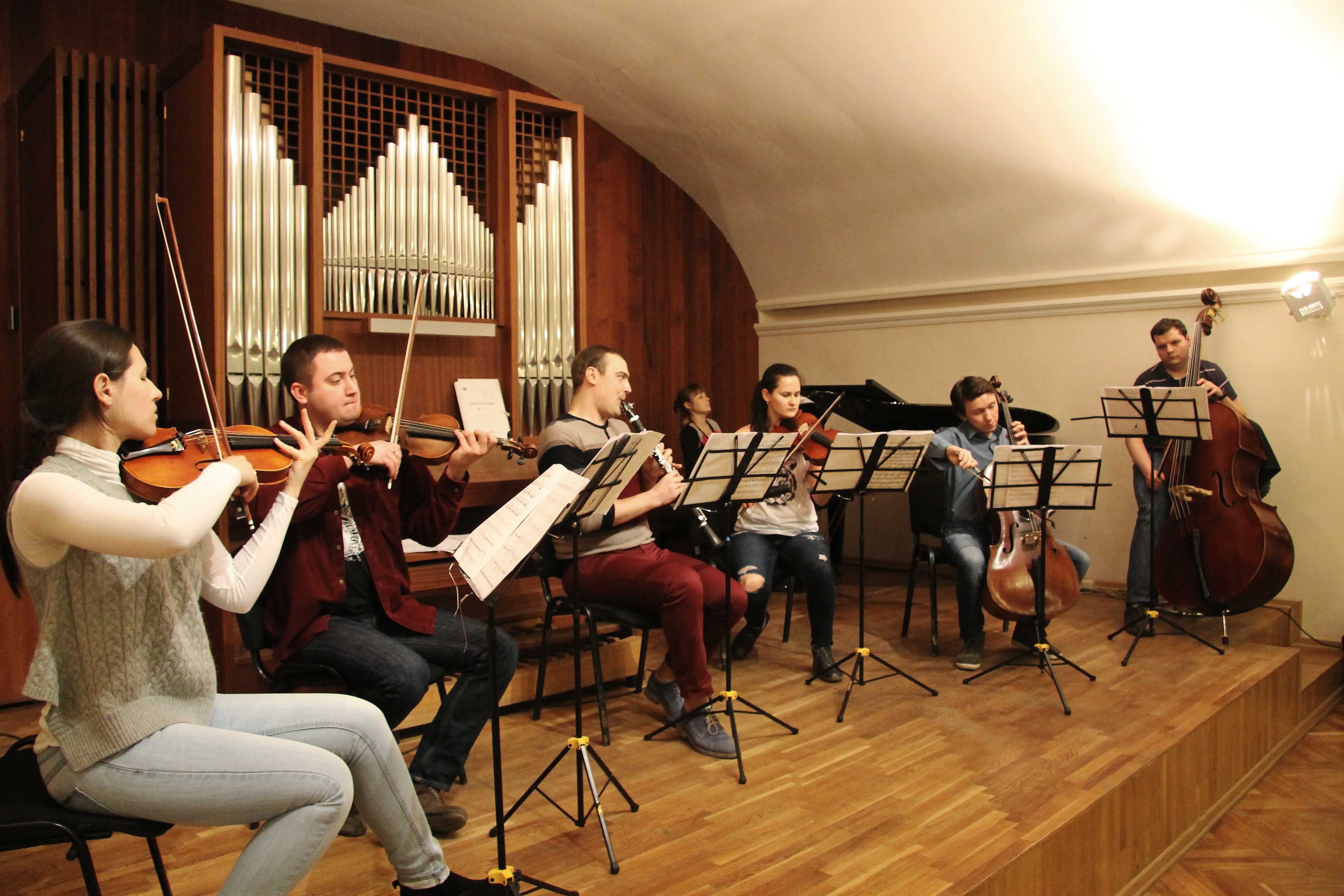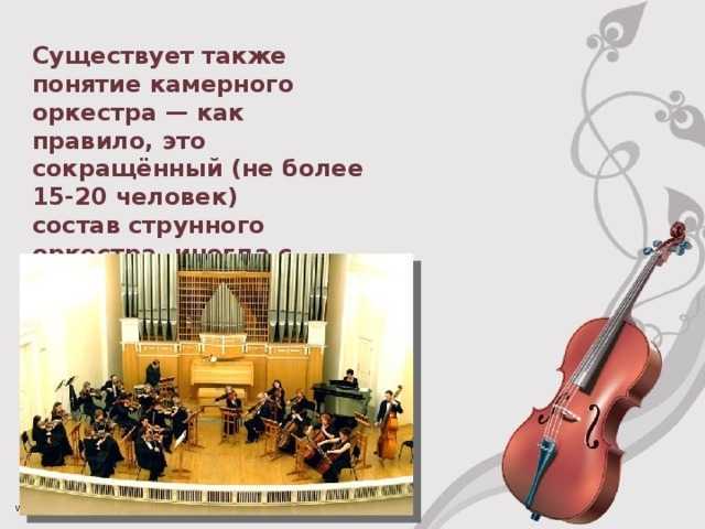 Есть и такое понятие, как камерный оркестр. Эта такой уменьшенный вариант (как правило, не более 10 человек) обычного оркестра. Ну и слушателей тоже не много. Обычно, это родственники, знакомые и друзья.