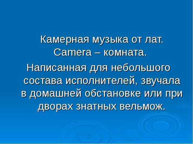 Камерная музыка от лат. Camera – комната. Камерная музыка от лат. Camera – комната. Написанная для небольшого состава исполнителей, звучала в домашней обстановке или при дворах знатных вельмож.