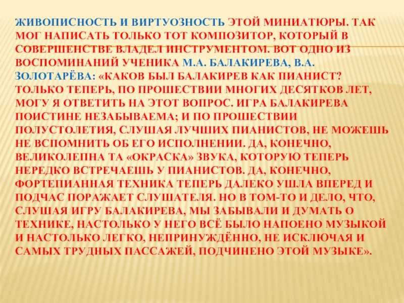 ученика М.А. Балакирева, В.А. Золотарёва: «Каков был Балакирев как пианист? Только теперь, по прошествии многих десятков лет, могу я ответить на этот вопрос. Игра Балакирева поистине незабываема; и по прошествии полустолетия, слушая лучших пианистов, не можешь не вспомнить об его исполнении. Да, конечно, великолепна та «окраска» звука, которую теперь нередко встречаешь у пианистов. Да, конечно, фортепианная техника теперь далеко ушла вперед и подчас поражает слушателя. Но в том-то и дело, что, слушая игру Балакирева, мы забывали и думать о технике, настолько у него всё было напоено музыкой и настолько легко, непринуждённо, не исключая и самых трудных пассажей, подчинено этой музыке».