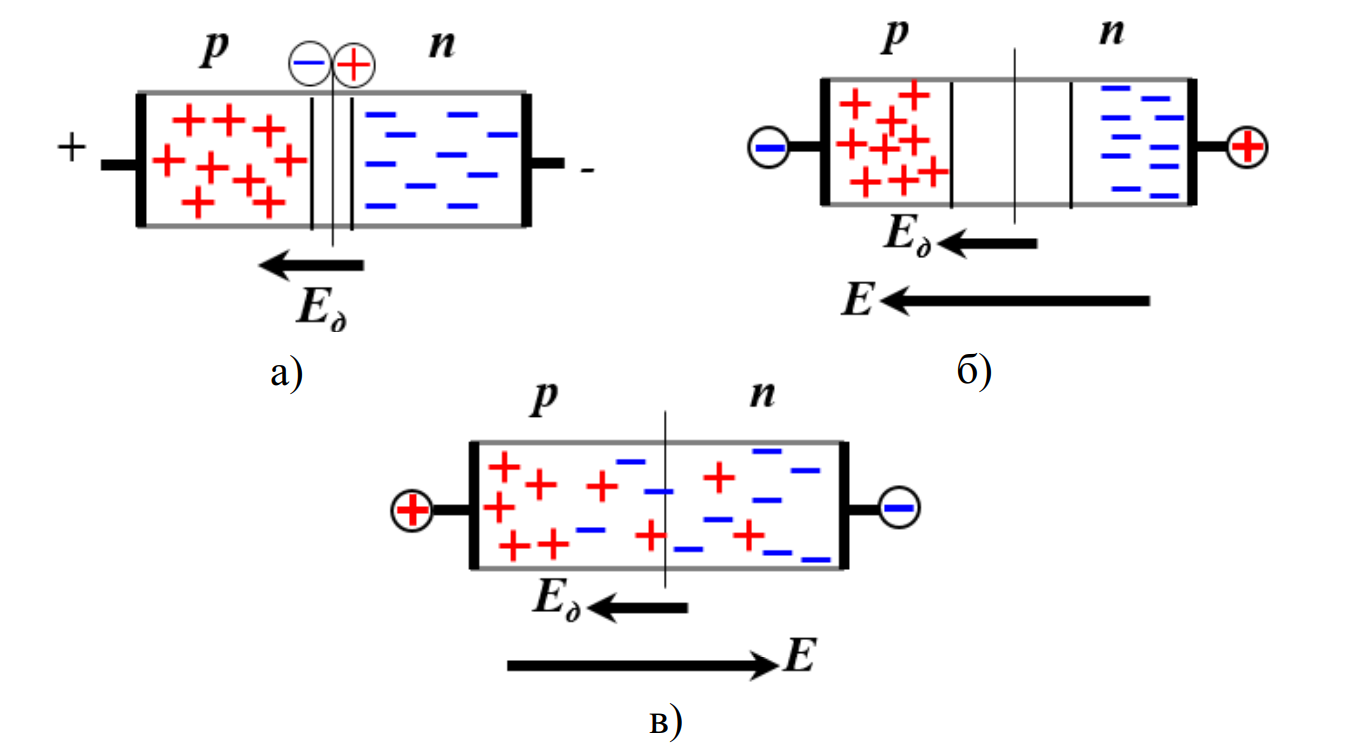 Если к такой системе приложить внешнее электрическое поле Е, напряжение которого совпадает с диффузионным электрическим полем Eд, то переход будет «заперт» и ток не будет протекать (рисунок 8, б).