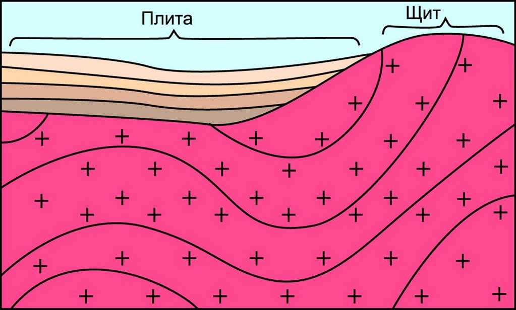 Платформы подразделяются на участки выходов на поверхность пород фундамента — щиты и на не менее крупные участки, покрытые чехлом — плиты.