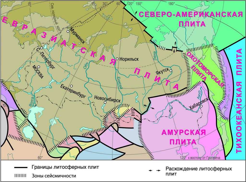 На востоке нашей страны, в Прибайкалье и Забайкалье происходит взаимодействие частей Евразийской литосферной плиты — Китайской и Сибирской платформ. В зоне их контакта растрескиваются обширные участки земной коры, формируется глубокая впадина озера Байкал.