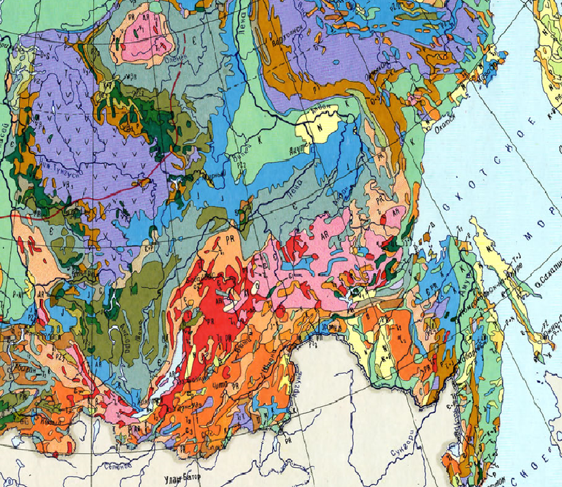 Поэтому на тектонической карте в пределах щита есть вкрапления разных цветов и буквенно-цифровых обозначений, которые сообщают о наличие различных магматических породах. Например: ярко-розовые участки с пометкой τ1 отвечают гранитоидам докембрийского периода, светло-оранжевые с пометкой ε1 — щелочным магматическим породам докембрийского периода.